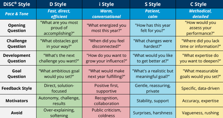The Performance Review by DiSC Style Quick Reference Guide is especially helpful here. It gives you ideas for: